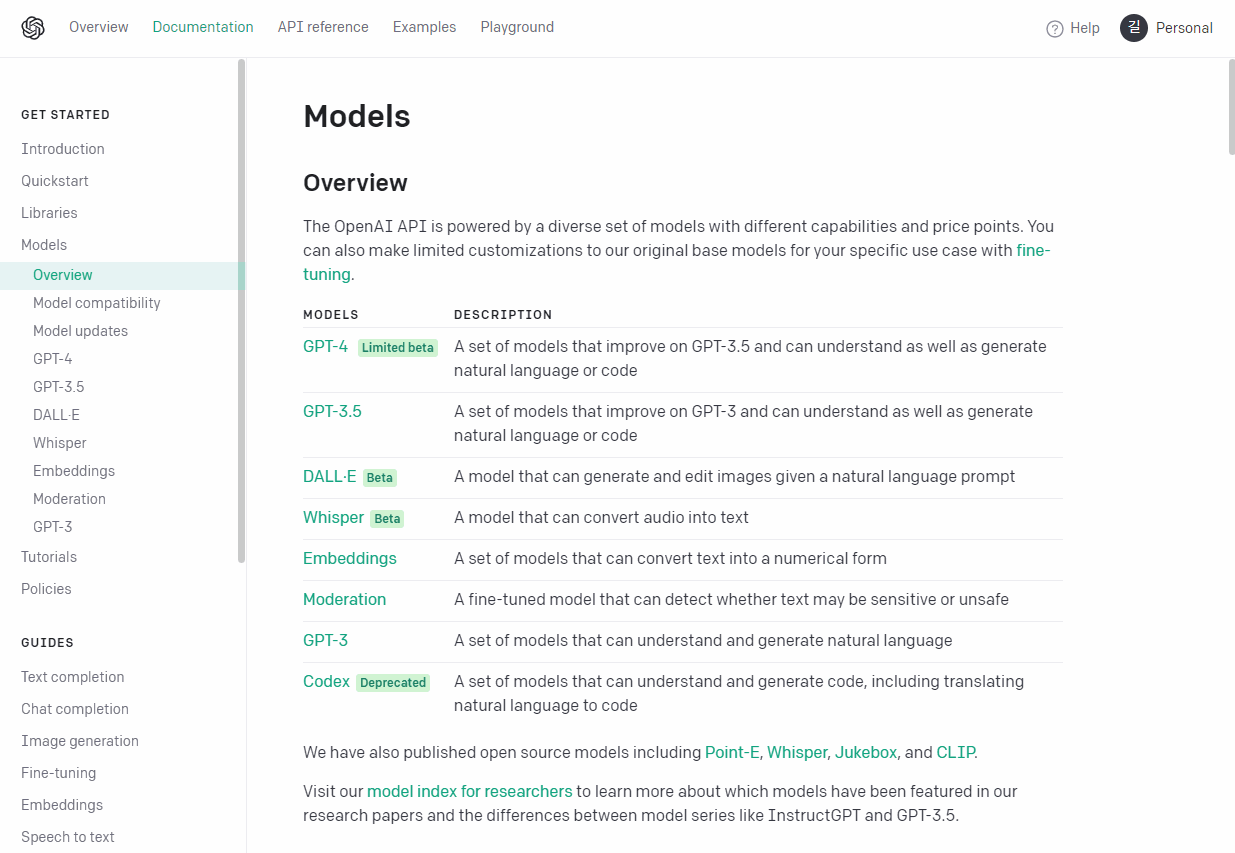 - 각 API(채팅, 이미지생성, 문장 완성 등등) 별로 사용할 수 있는 Model 이 다르기 때문에 한번 읽어보고 사용해야 한다.