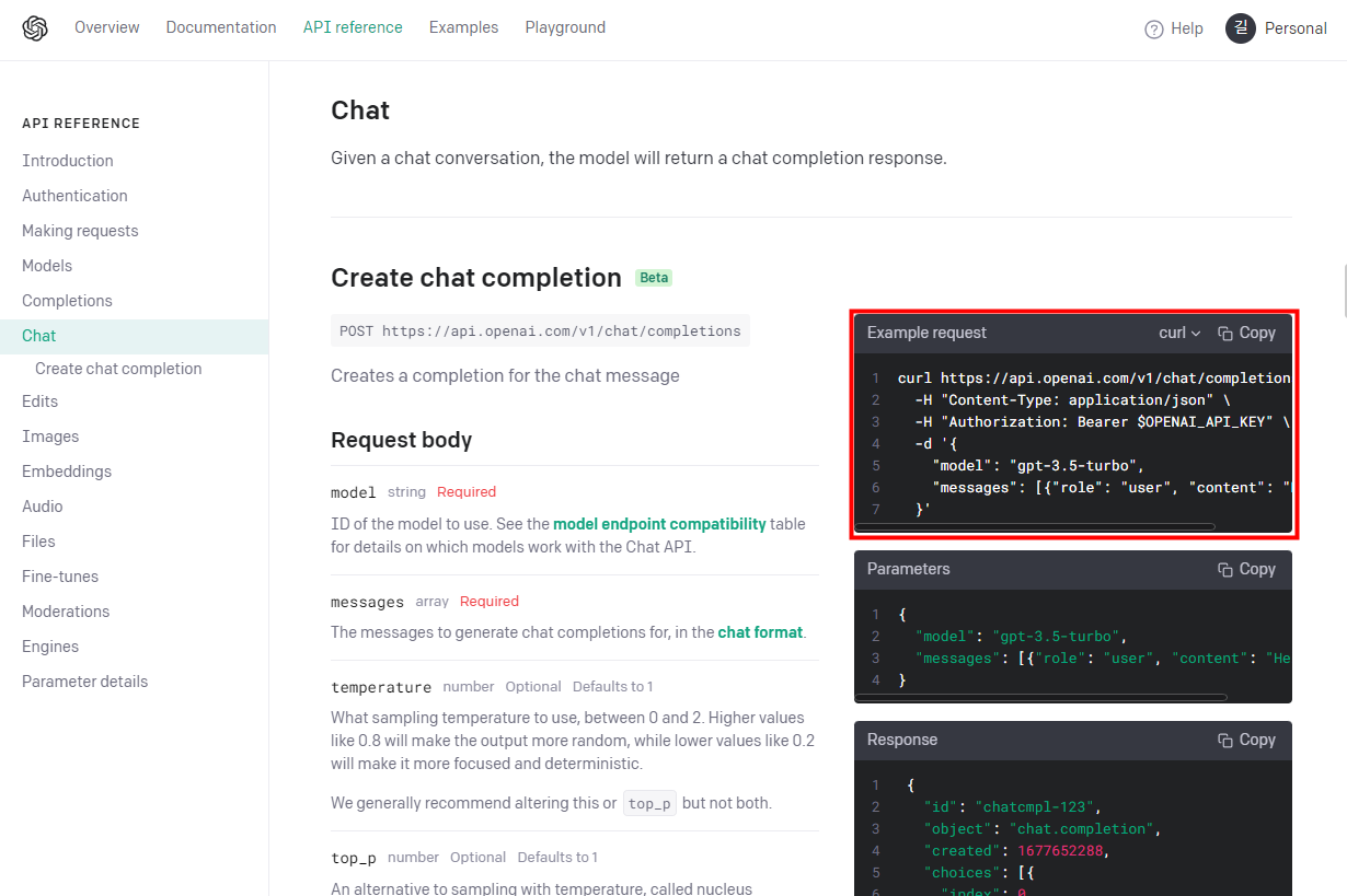 - API 호출 방법 ( https://platform.openai.com/docs/api-reference/chat )