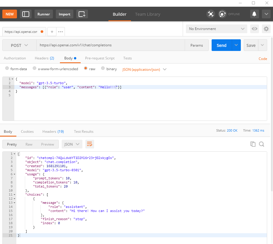 - Chat API를 활용한 호출 테스트로 Hello!!! 라고 질문 시 Hi there! How can I assist you today? 라고 리턴된걸 확인 가능하다.