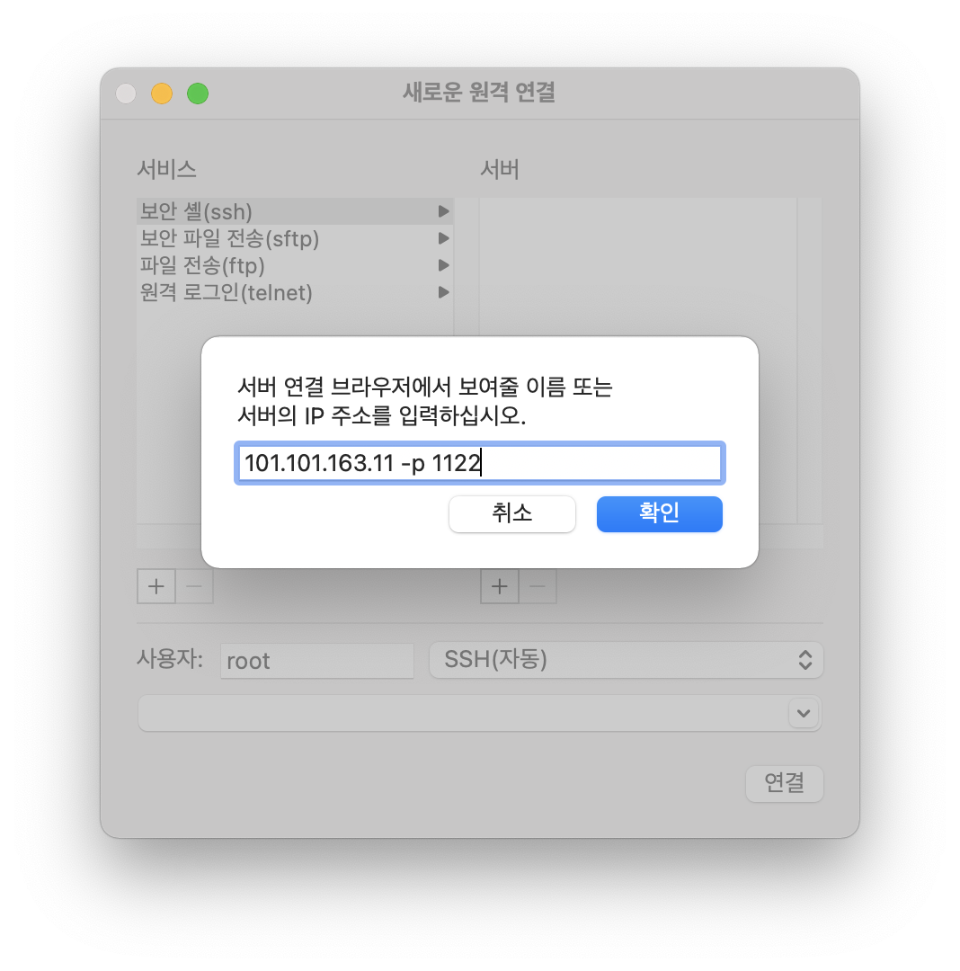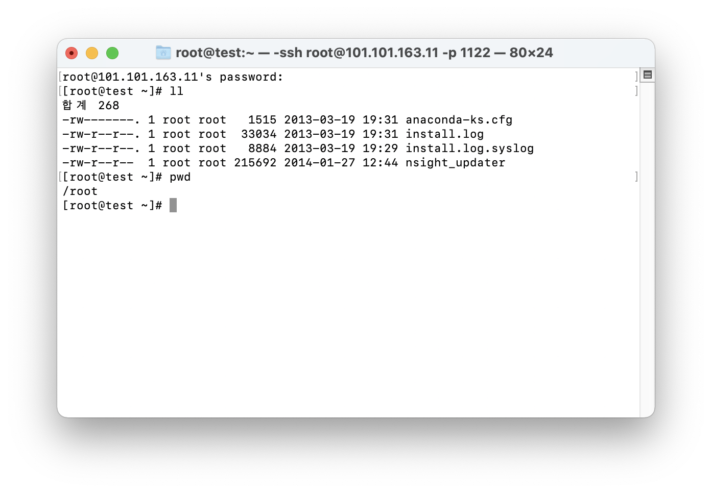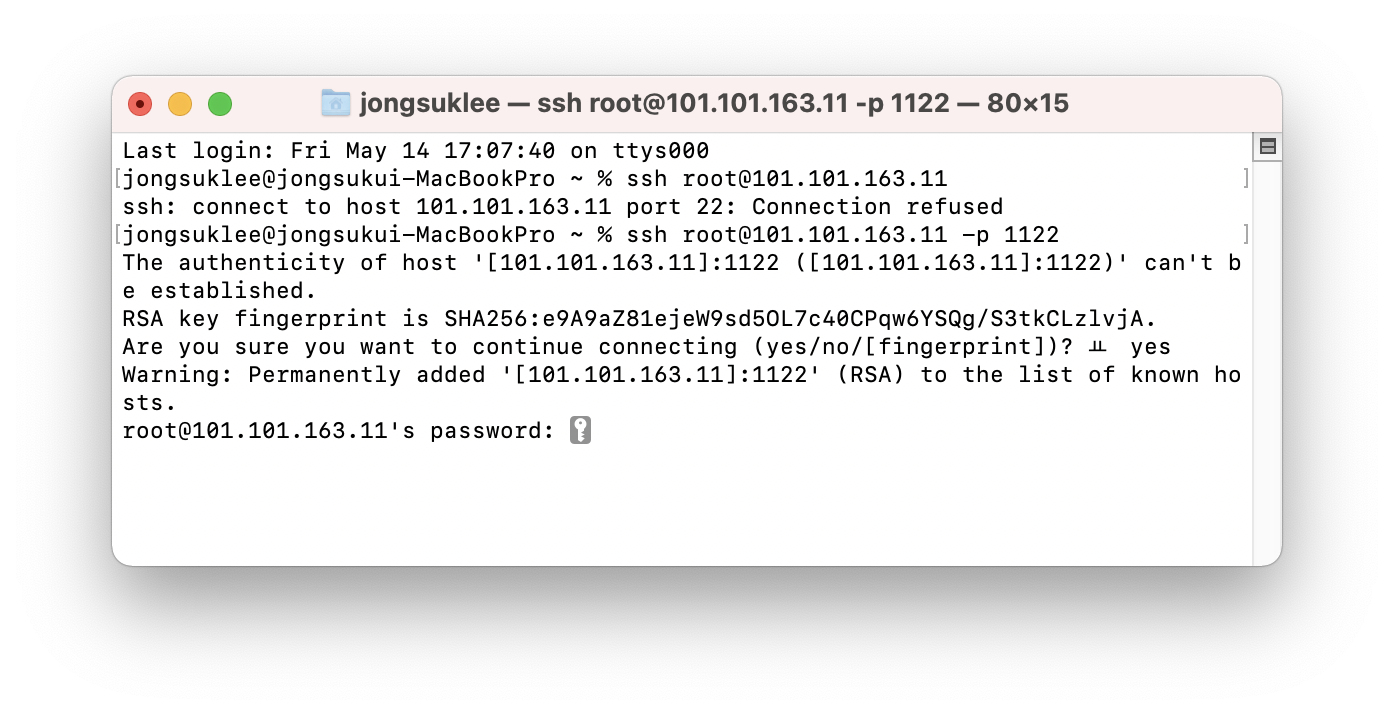 우리는 기본포트가 아니기 때문에 ssh 옵션으로 port를 변경하기 위해 '101.101.163.11 -p 1122' 라고 입력해주었다.