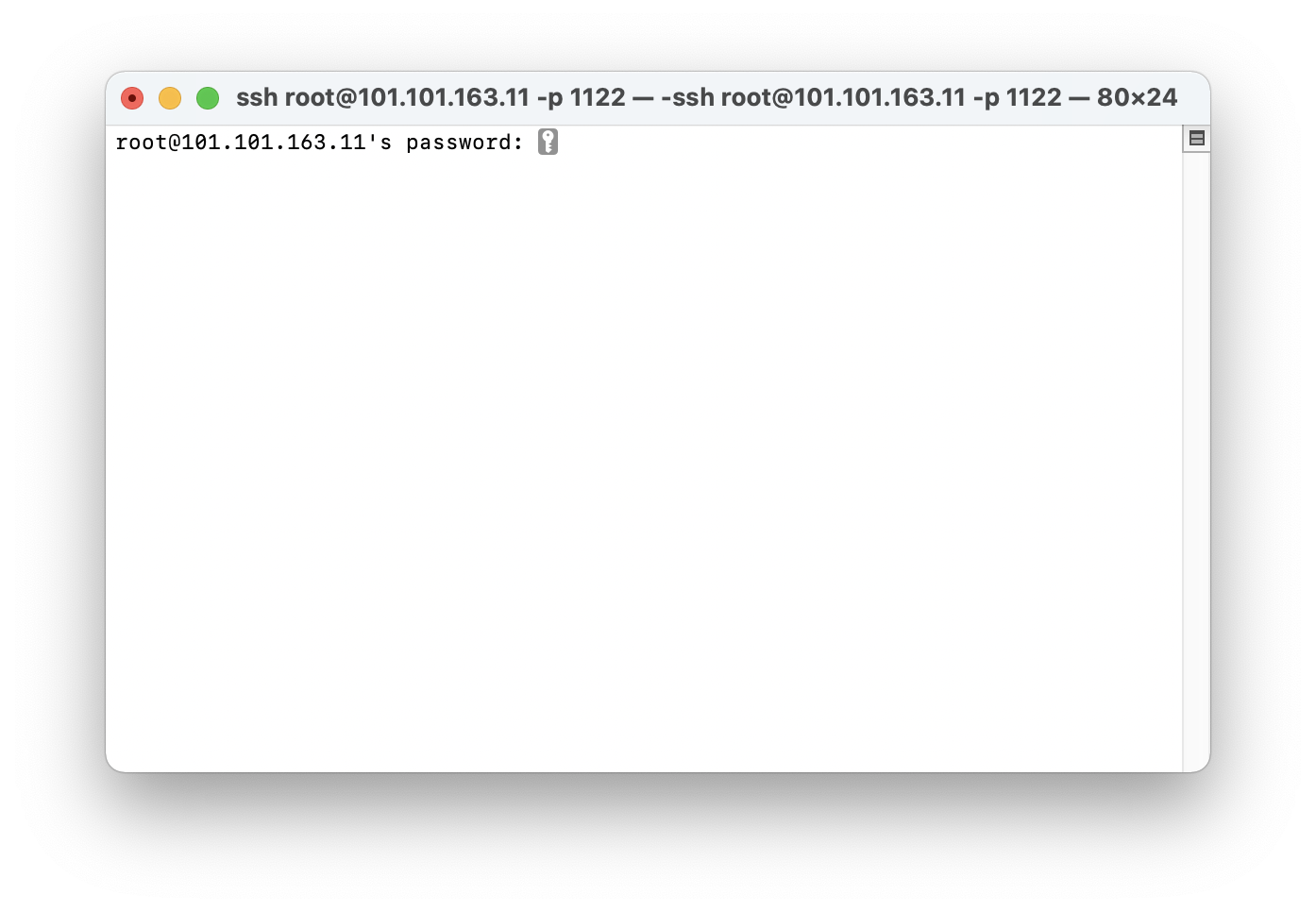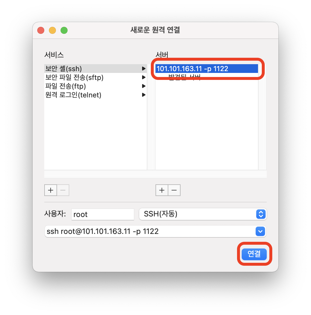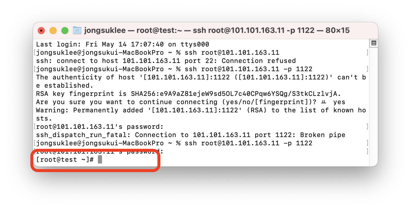 우리는 기본포트가 아니기 때문에 ssh 옵션으로 port를 변경하기 위해 '101.101.163.11 -p 1122' 라고 입력해주었다.