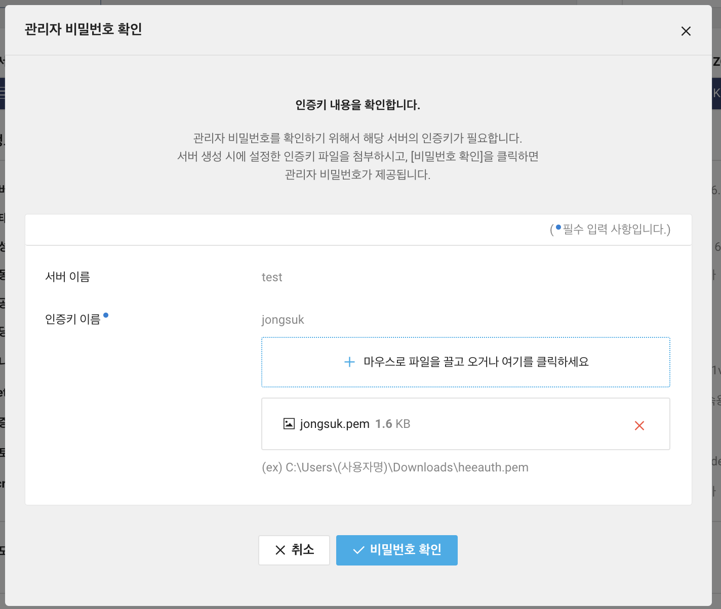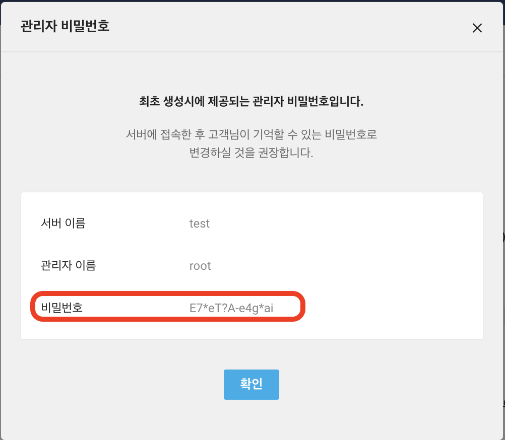 - 비밀번호는 서버 만들 때 발행한 인증키로 임시 비밀번호를 발급 받아야 한다.