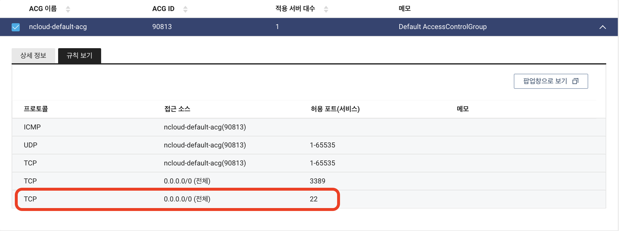 그리고 꼭 ACG 에 아래와 같이 22번 포트가 오픈 되어 있어야 접근이 가능하다.