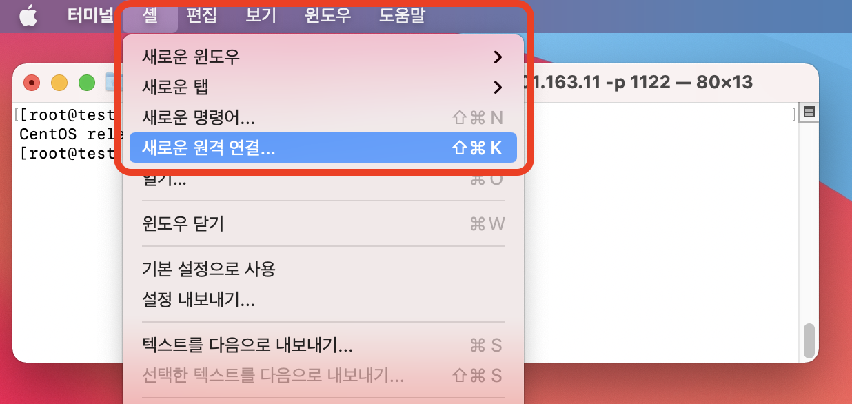 아래와 같이 터미널 메뉴에서 '셀 > 새로운 원격 연결...' 을 클릭한다.