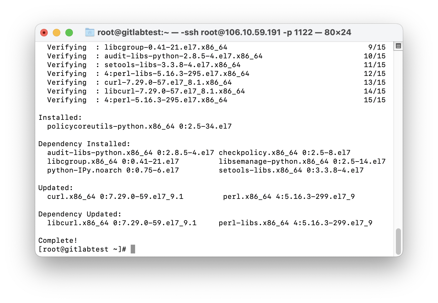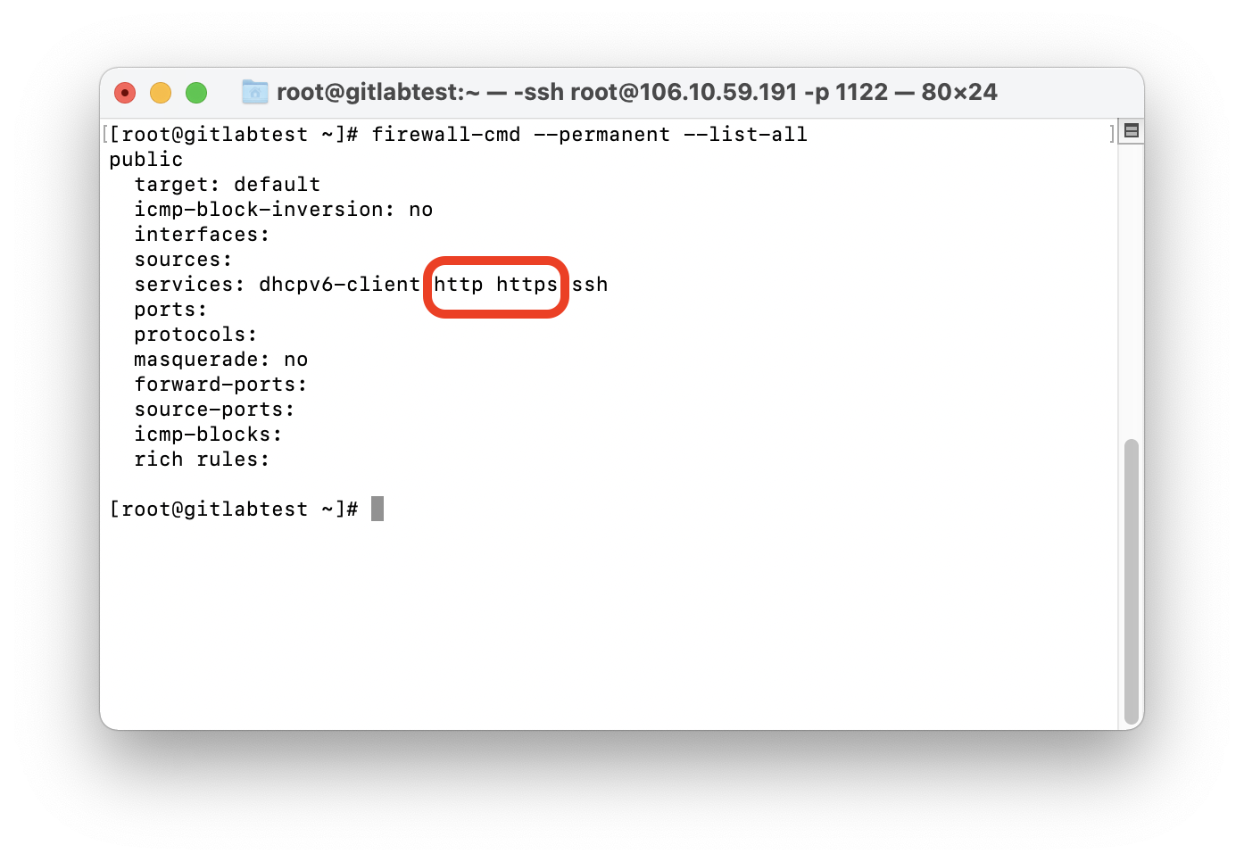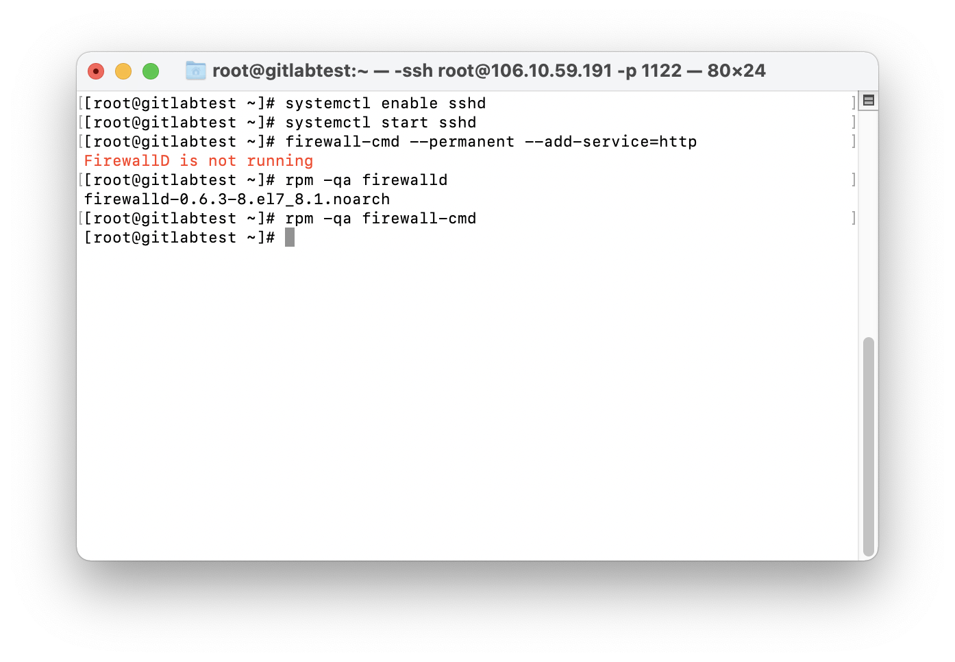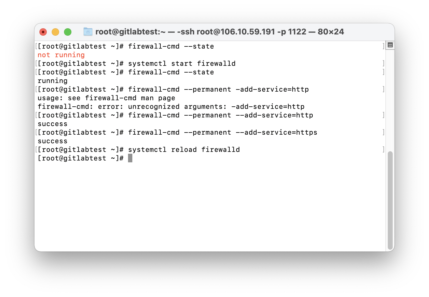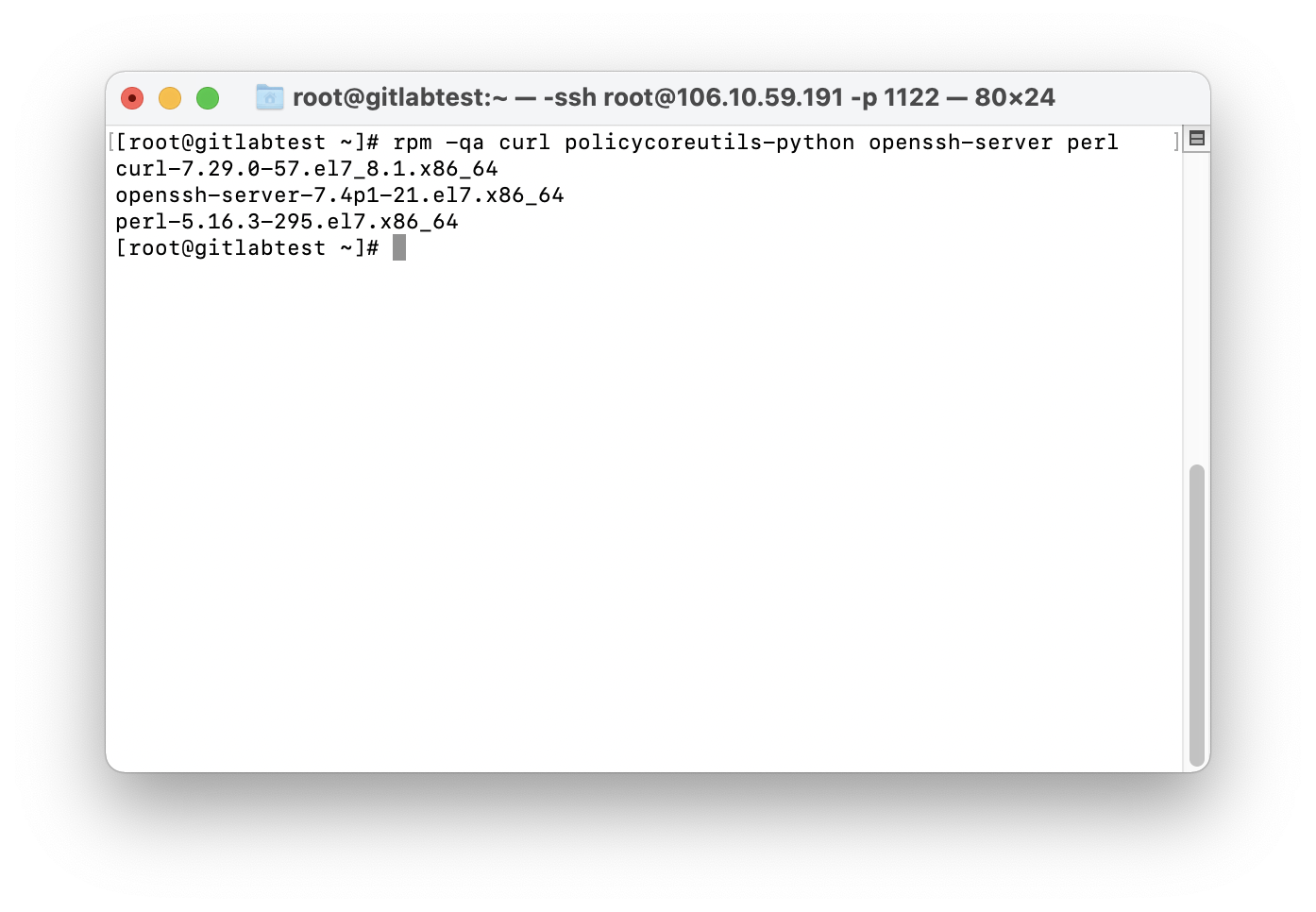 | sudo yum install -y curl policycoreutils-python openssh-server perl sudo systemctl enable sshd sudo systemctl start sshd sudo firewall-cmd --permanent --add-service=http sudo firewall-cmd --permanent --add-service=https sudo systemctl reload firewalld |