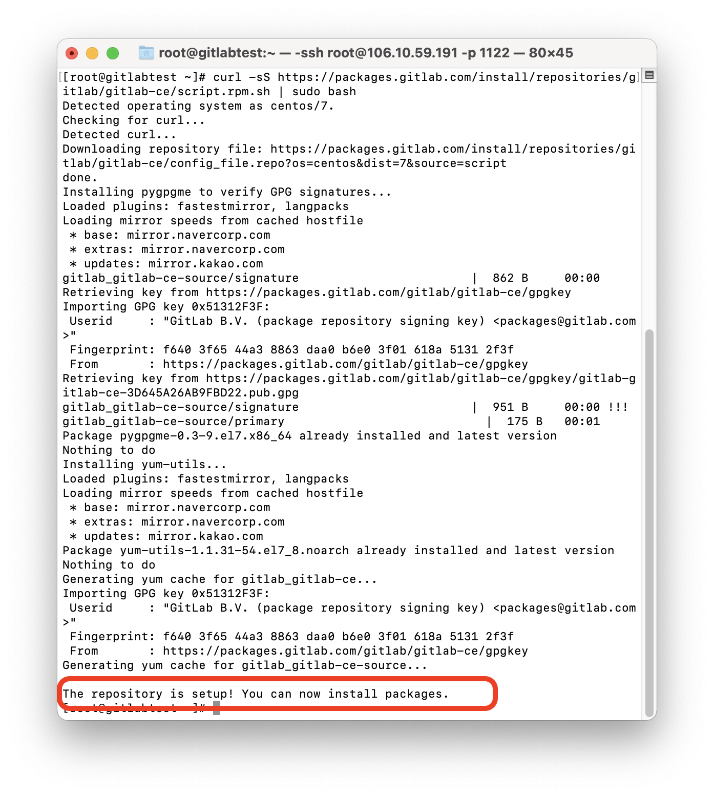 # curl -sS https://packages.gitlab.com/install/repositories/gitlab/gitlab-ce/script.rpm.sh | sudo bash