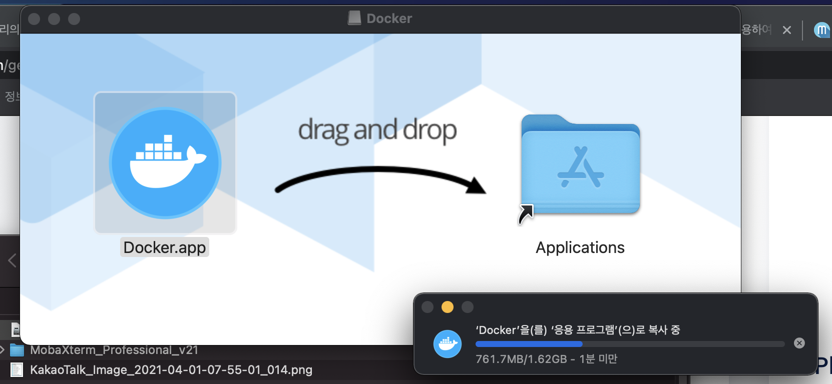 Docker.app 을 Applications 로 Drag and drop 하면 설치가 진행 된다.