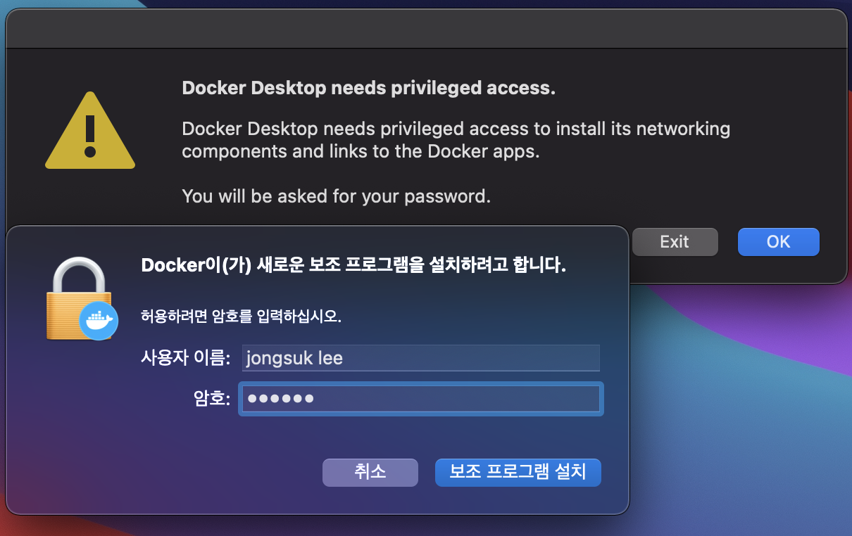 아래 이미지와 같이 OS 비밀번호를 입력하라고 표시가 될 수도 있다.