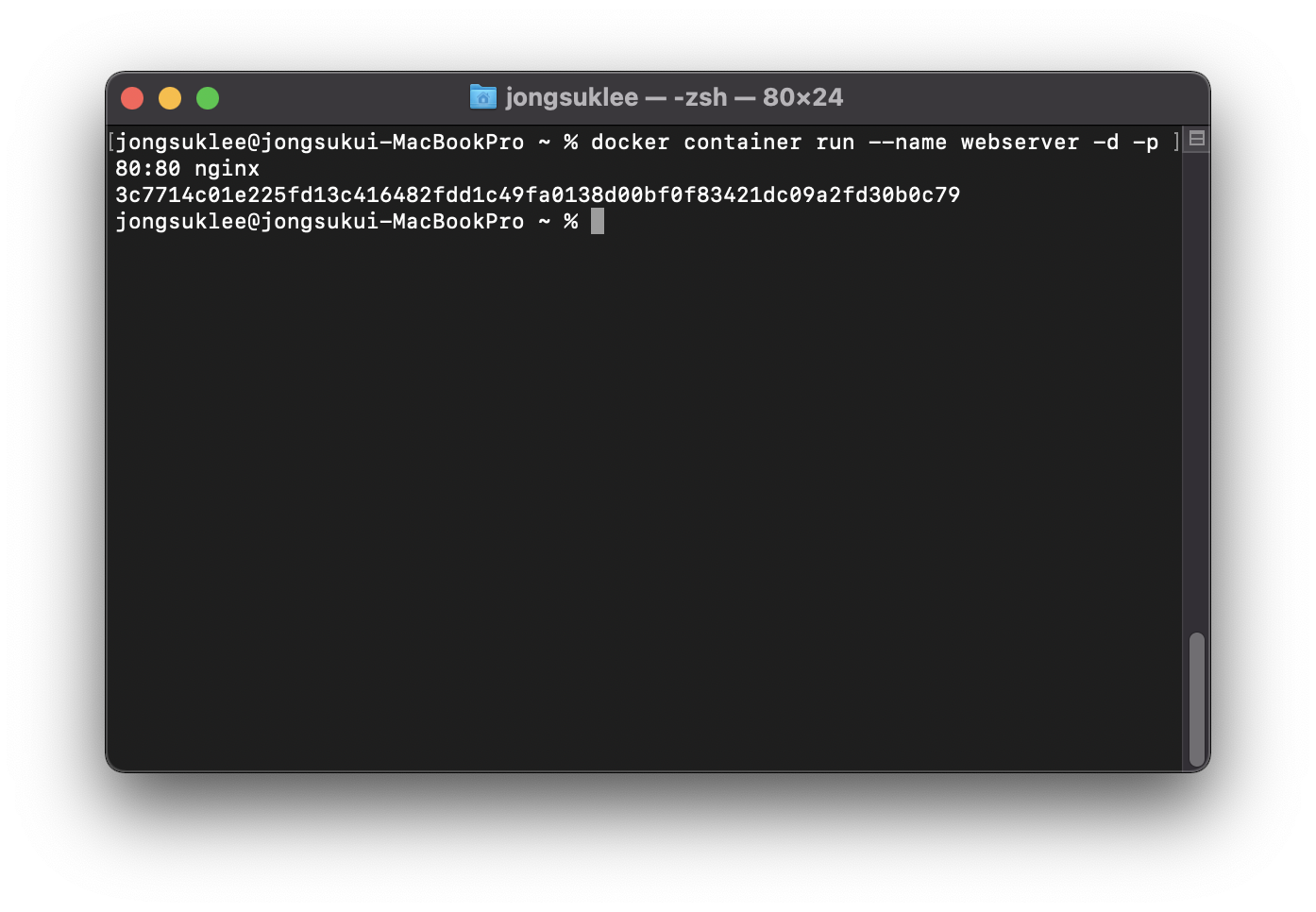 nginx 이미지를 가지고 webserver 라는 이름의 컨테이너를 새로 만들어서 80포트로 활성화 한다.