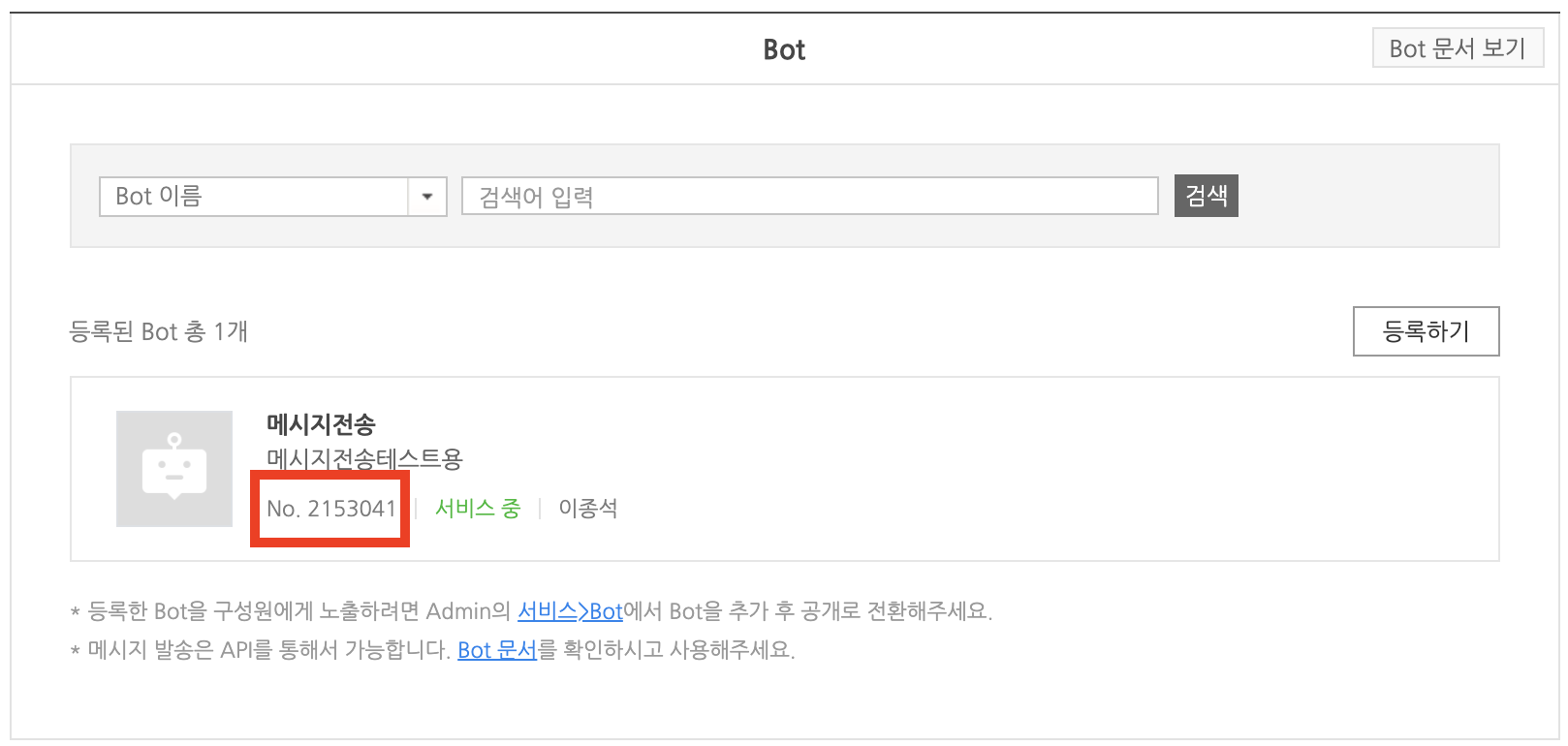 등록 후 고유 메시지 Bot 번호가 부여된다.