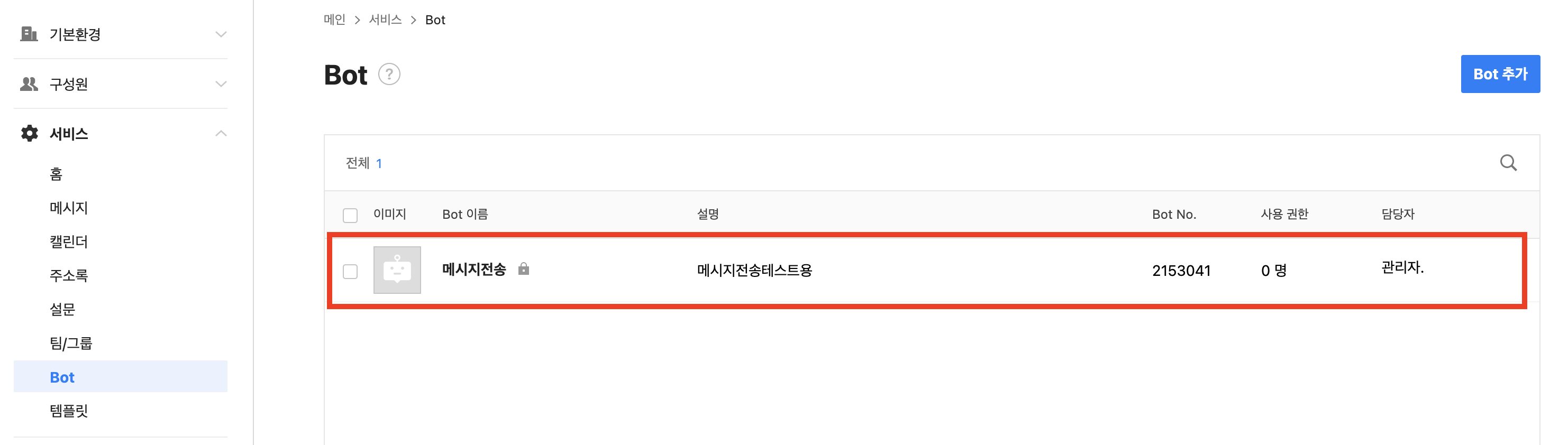 서비스 > Bot 메뉴에 다시 접속 하면 추가된걸 확인 할 수 있다.