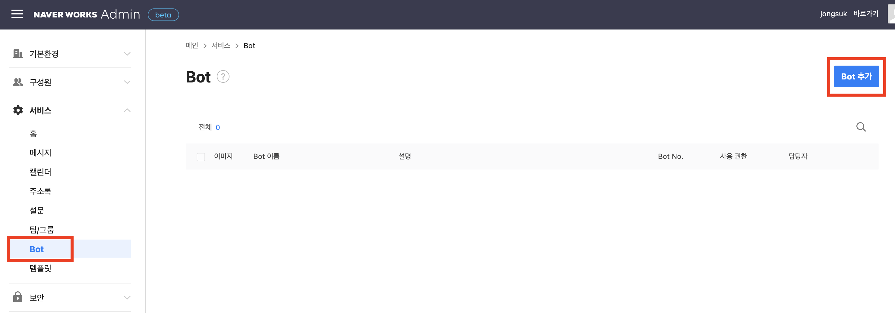 서비스 > Bot 메뉴에서 'Bot 추가' 버튼 클릭