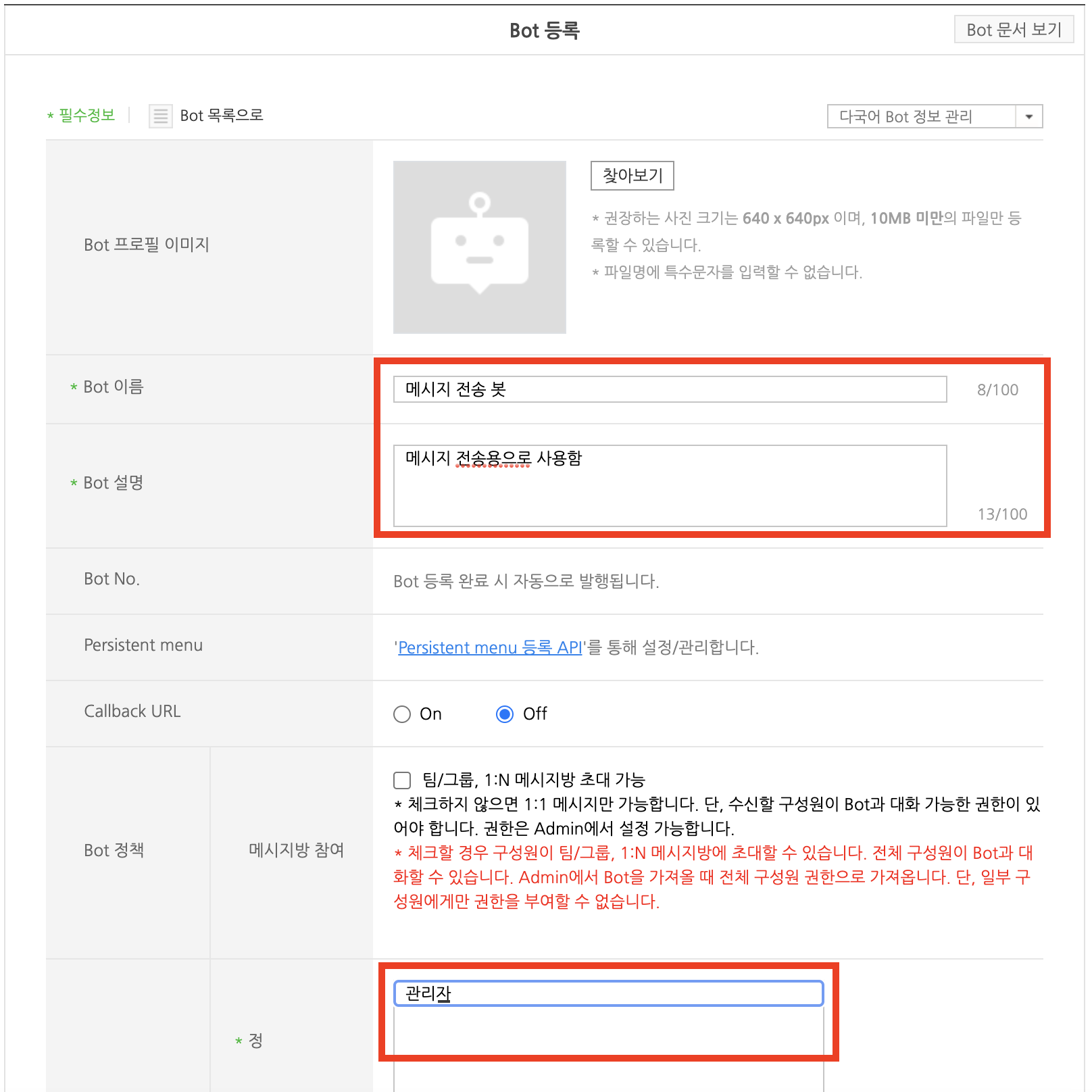 Bot 프로필 이미지 : 메시지 대화방에 표시되는 사진을 등록 하면 된다.