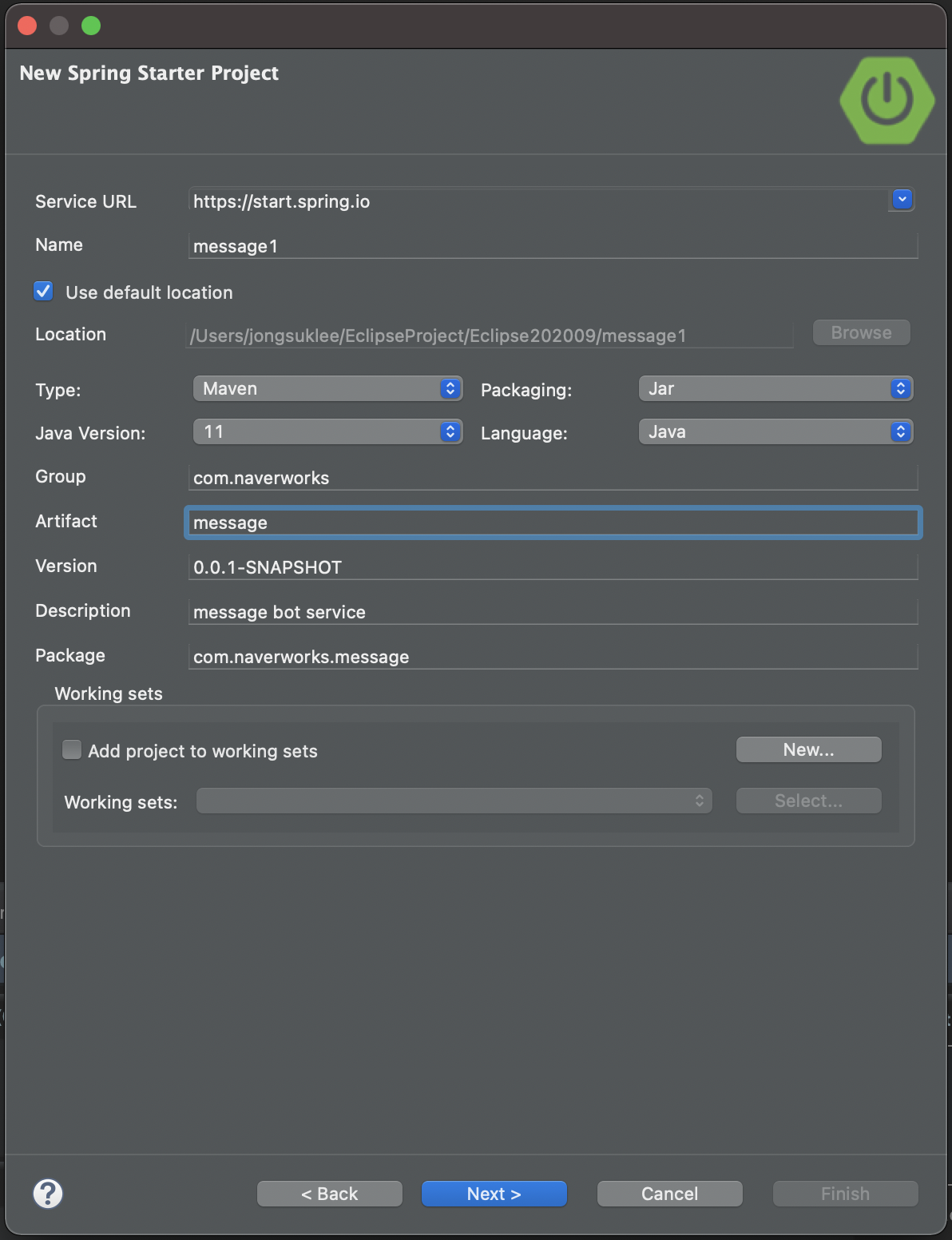 Wizards 에서 Spring 으로 검색하여 나오는 Spring Starter Project 로 진행