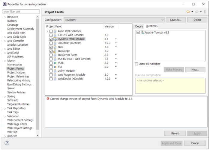 - Tomcat 8.5 가 Dynamic Web Module 4.0을 지원하지 못해서 발생