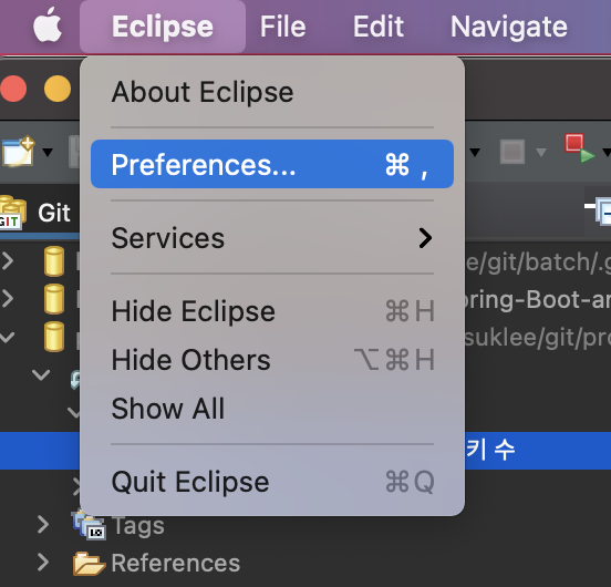 좌측 상단 메뉴에서 Eclipse > Preferences... 클릭